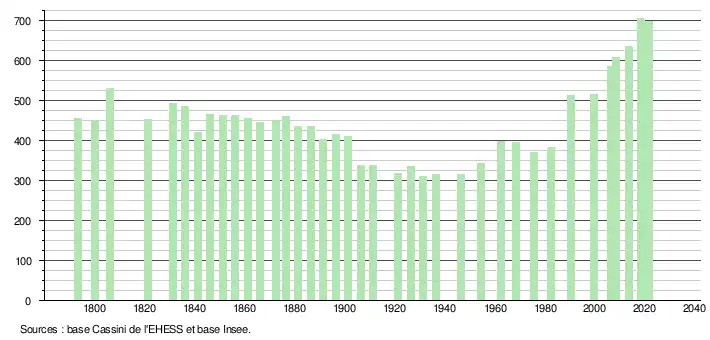 L'évolution du nombre d'habitants est connue à travers les recensements de la population effectués dans la commune depuis 1793. Pour les communes de moins de 10 000 habitants, une enquête de recensement portant sur toute la population est réalisée tous les cinq ans, les populations légales des années intermédiaires étant quant à elles estimées par interpolation ou extrapolation[23]. Pour la commune, le premier recensement exhaustif entrant dans le cadre du nouveau dispositif a été réalisé en 2008[24].