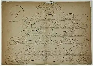 - Vlieghende capitalen ofte voorletteren, dienende tot behulp ende voorderinghe van alle schoolmeesters ende beminders der pennen. Wytghegheven door Jan vanden Velde, Francoysche Schoolm[eester] binnen de wÿtberoemde en konstrÿcke stadt Haerlem, Ende int koper ghesneden door M. Lieven Willems Koppenol Francoysche Schoolm[eester] binne Amsterd. Anno 1619. London BM. Voir une [page https://www.britishmuseum.org/research/collection_online/collection_object_details/collection_image_gallery.aspx?assetId=59798&objectId=761752&partId=1 ici].