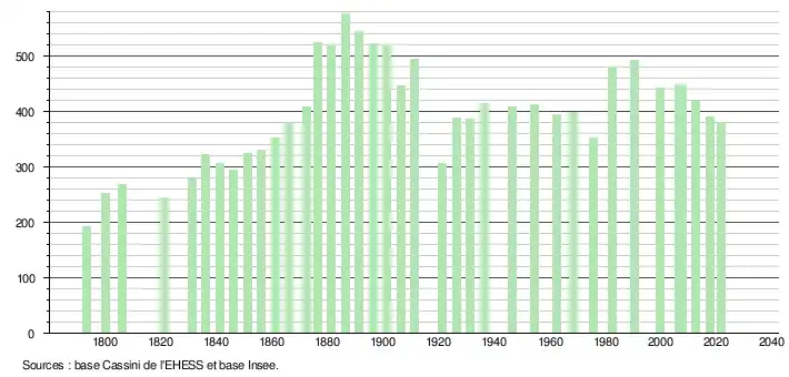 L'évolution du nombre d'habitants est connue à travers les recensements de la population effectués dans la commune depuis 1793. Pour les communes de moins de 10 000 habitants, une enquête de recensement portant sur toute la population est réalisée tous les cinq ans, les populations légales des années intermédiaires étant quant à elles estimées par interpolation ou extrapolation[21]. Pour la commune, le premier recensement exhaustif entrant dans le cadre du nouveau dispositif a été réalisé en 2007[22].