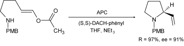 - Les ligands de Trost peuvent aussi catalyser la formation de liaison C-N dans des AAA/Pd avec des nucléophiles amine par exemple[11]: