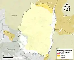 Le retrait-gonflement des sols argileux est susceptible d'engendrer des dommages importants aux bâtiments en cas d’alternance de périodes de sécheresse et de pluie. 4,5 % de la superficie communale est en aléa moyen ou fort (67,4 % au niveau départemental et 48,5 % au niveau national). Sur les 115 bâtiments dénombrés sur la commune en 2019, 2 sont en aléa moyen ou fort, soit 2 %, à comparer aux 81 % au niveau départemental et 54 % au niveau national. Une cartographie de l'exposition du territoire national au retrait gonflement des sols argileux est disponible sur le site du BRGM[20],[Carte 3].