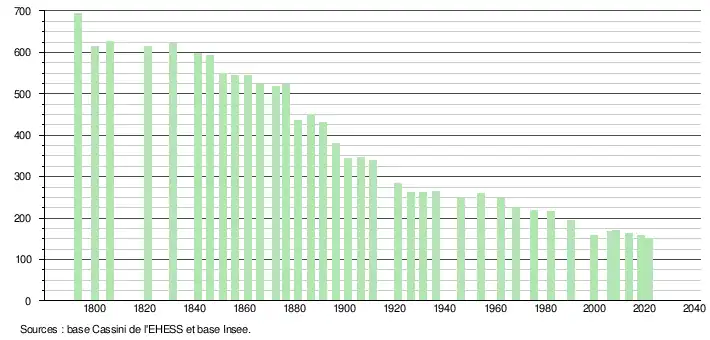 L'évolution du nombre d'habitants est connue à travers les recensements de la population effectués dans la commune depuis 1793. Pour les communes de moins de 10 000 habitants, une enquête de recensement portant sur toute la population est réalisée tous les cinq ans, les populations légales des années intermédiaires étant quant à elles estimées par interpolation ou extrapolation[29]. Pour la commune, le premier recensement exhaustif entrant dans le cadre du nouveau dispositif a été réalisé en 2008[30].