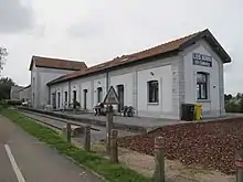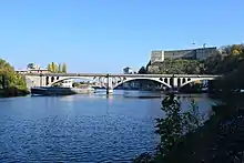 - Au lendemain de la guerre, le pont de fer, dynamité[2], fut reconstruit en pierre et prévu pour la double voie, qui ne vit jamais le jour. L'espace dévolu à la seconde voie fait aujourd'hui office de chemin pédestre.