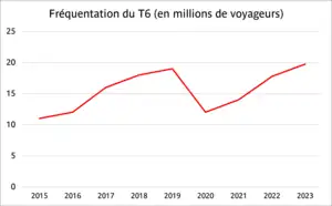 Le trafic escompté avant la mise en service complète de la ligne, entre Châtillon-Montrouge et Viroflay-Rive-Droite, était de 22 millions de voyageurs chaque année et 82 000 voyageurs chaque jour[50],[51]. En 2016, avant le prolongement de Robert Wagner à Viroflay-Rive-Droite, la ligne transportait 50 000 voyageurs par jour[52]. En , ce nombre s'élève à 57 200[51], alors que la ligne est intégralement ouverte depuis .