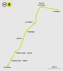 La ligne 9 se poursuit sous la rue Michel-Ange en desservant Exelmans, passe successivement sous les voies sud, puis nord de la boucle de la ligne 10 qui desservent les deux stations Michel-Ange, Molitor et Auteuil, puis après un raccordement avec cette dernière, traverse le 16e arrondissement sous la rue La Fontaine, l'avenue Mozart, la rue de la Pompe, puis l'avenue Georges-Mandel. Elle atteint les stations Jasmin, Ranelagh, La Muette et Rue de la Pompe après une longue interstation de 923 mètres.