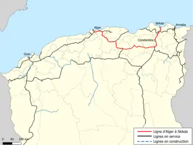 La décision de créer la première ligne de voyageurs a été prise en 1857. En 1860, la Compagnie des chemins de fer algériens obtient la concession pour la ligne entre Philippeville (Skikda) et Constantine sur 87 km mais elle ne réussira pas à la réaliser[1],[2],[3].