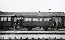 Voiture à deux essieux en gare de Joigny, devant la remise à locomotives.