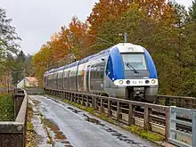 Un train TER Saint-Dié - Nancy, peu après son départ de Saint-Dié | |