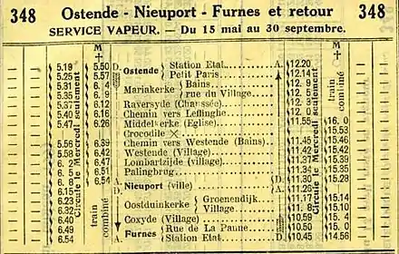 Tableaux[note 1] : 348 (1931)[6], n° de tableau partagé par les lignes 7 Furnes - Coxyde, 9 Furnes - Ostdunkerque, 21 Adinkerque - La Panne et 348 Ostende - Furnes.