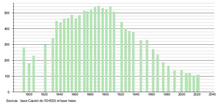 L'évolution du nombre d'habitants est connue à travers les recensements de la population effectués dans la commune depuis 1793. Pour les communes de moins de 10 000 habitants, une enquête de recensement portant sur toute la population est réalisée tous les cinq ans, les populations légales des années intermédiaires étant quant à elles estimées par interpolation ou extrapolation[30]. Pour la commune, le premier recensement exhaustif entrant dans le cadre du nouveau dispositif a été réalisé en 2005[31].
