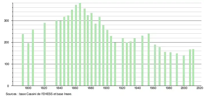 - Dans le tableau des recensements et le graphique, par convention dans Wikipédia, le principe a été retenu, pour les populations légales postérieures à 1999 de n’afficher dans le tableau des recensements et le graphique que les populations correspondant à l'année 2006, première population légale publiée calculée conformément aux concepts définis dans le décret no 2003-485 du 5 juin 2003, et les années correspondant à une enquête exhaustive de recensement pour les communes de moins de 10 000 habitants, ainsi que la dernière population légale publiée par l’Insee.