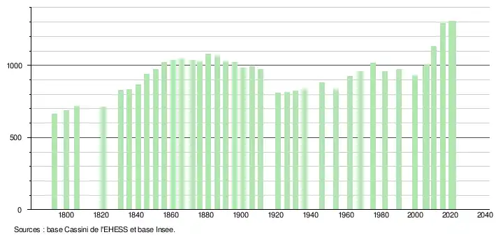 L'évolution du nombre d'habitants est connue à travers les recensements de la population effectués dans la commune depuis 1793. Pour les communes de moins de 10 000 habitants, une enquête de recensement portant sur toute la population est réalisée tous les cinq ans, les populations légales des années intermédiaires étant quant à elles estimées par interpolation ou extrapolation[33]. Pour la commune, le premier recensement exhaustif entrant dans le cadre du nouveau dispositif a été réalisé en 2005[34].