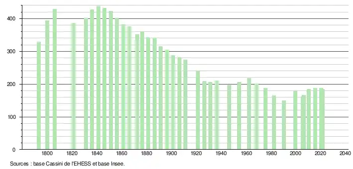 L'évolution du nombre d'habitants est connue à travers les recensements de la population effectués dans la commune depuis 1793. Pour les communes de moins de 10 000 habitants, une enquête de recensement portant sur toute la population est réalisée tous les cinq ans, les populations légales des années intermédiaires étant quant à elles estimées par interpolation ou extrapolation[16]. Pour la commune, le premier recensement exhaustif entrant dans le cadre du nouveau dispositif a été réalisé en 2005[17].