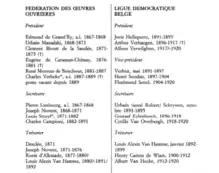 Joris Helleputte, fondateur et premier président de la Ligue, avait la volonté de concevoir le projet de fédérer les œuvres sociales. Sa proposition fut de « regrouper les nouvelles associations par un lien étroit et d’opposer aux groupements redoutables du socialisme un organisme qui associerait en de communs efforts tous les ouvriers chrétiens ». C’est le , lors d’une seconde réunion précédant celle du , que les statuts de la Ligue sont définitivement arrêtés[8]. Helleputte est nommé président à l’unanimité et publie un manifeste à l’attention des sociétés ouvrières ainsi qu’à l’attention du pays dans le but de faire connaître les tendances et les objectifs de cette nouvelle organisation. Lorsqu’elle est conçue, des mesures spéciales sont prises par le bureau de la même Ligue afin d’assurer aux deux langues nationales un traitement égalitaire[9]. En 1896, Helleputte sera transféré à Gand à la suite de l’élection du nouveau président, Arthur Verhaegen, ainsi qu’à l’élection au secrétariat de Gustaaf Eylenbosch.