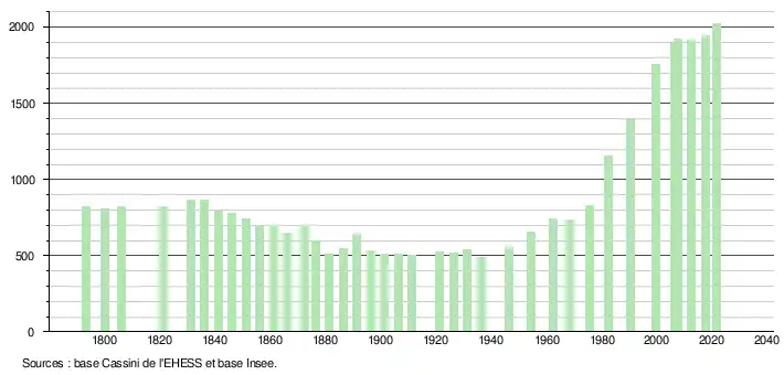 L'évolution du nombre d'habitants est connue à travers les recensements de la population effectués dans la commune depuis 1793. Pour les communes de moins de 10 000 habitants, une enquête de recensement portant sur toute la population est réalisée tous les cinq ans, les populations légales des années intermédiaires étant quant à elles estimées par interpolation ou extrapolation[31]. Pour la commune, le premier recensement exhaustif entrant dans le cadre du nouveau dispositif a été réalisé en 2007[32].
