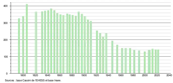 L'évolution du nombre d'habitants est connue à travers les recensements de la population effectués dans la commune depuis 1793. Pour les communes de moins de 10 000 habitants, une enquête de recensement portant sur toute la population est réalisée tous les cinq ans, les populations légales des années intermédiaires étant quant à elles estimées par interpolation ou extrapolation[21]. Pour la commune, le premier recensement exhaustif entrant dans le cadre du nouveau dispositif a été réalisé en 2007[22].
