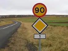 Panneau de signalisation routière indiquant une limitation de vitesse à 90 km/h (et un régime de priorité) sur une portion goudronnée de la route 1 non loin de Goðafoss.
