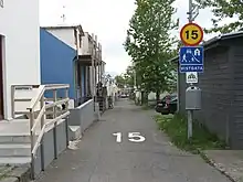 Panneau de signalisation routière et signalisation horizontale indiquant une limitation de vitesse à 15 km/h dans une petite rue de Reykjavik.
