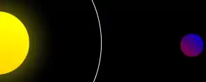 ![]() Considérons un corps fluide qui maintient sa structure par sa gravité et qui orbite autour d'un objet massif, vu ici par le dessus du plan orbital. Éloigné de la limite de Roche, sa forme est sphérique. |