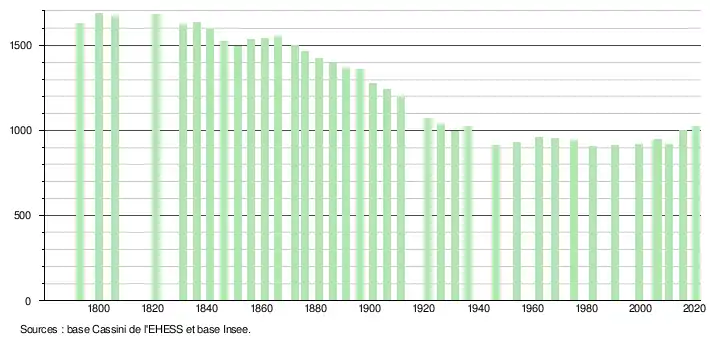 L'évolution du nombre d'habitants est connue à travers les recensements de la population effectués dans la commune depuis 1793. Pour les communes de moins de 10 000 habitants, une enquête de recensement portant sur toute la population est réalisée tous les cinq ans, les populations légales des années intermédiaires étant quant à elles estimées par interpolation ou extrapolation[32]. Pour la commune, le premier recensement exhaustif entrant dans le cadre du nouveau dispositif a été réalisé en 2005[33].