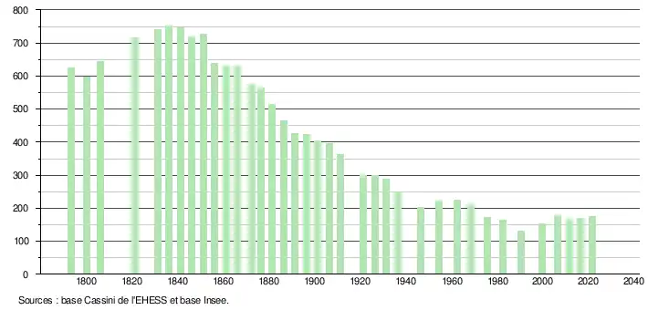L'évolution du nombre d'habitants est connue à travers les recensements de la population effectués dans la commune depuis 1793. Pour les communes de moins de 10 000 habitants, une enquête de recensement portant sur toute la population est réalisée tous les cinq ans, les populations légales des années intermédiaires étant quant à elles estimées par interpolation ou extrapolation[17]. Pour la commune, le premier recensement exhaustif entrant dans le cadre du nouveau dispositif a été réalisé en 2006[18].