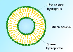 La bicouche de phospholipides sépare le milieu intravésiculaire du milieu extérieur aqueux. Les têtes polaires des phospholipides sont à l'extérieur et les queues apolaires sont au bord du milieu intérieur, minimisant ainsi les interactions entre les composantes hydrophobes[3].