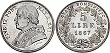 Le 18 juin 1866, sous la pression du gouvernement du Royaume italien unifié en 1861, le pape Pie IX, assisté de son trésorier, Giacomo Antonelli, abandonne le scudo et commence à faire émettre une nouvelle monnaie, la lire, divisée en 20 soldi (soldo au singulier) ou 100 centesimi (centesimo au singulier). Le taux de conversion est de 5,375 lires pour 1 scudo. Les poids et métaux des types monétaires sont similaires à la lire italienne qui a cours légal dans ces États. De facto, cette monnaie intègre l'Union latine[1]. Fin 1870, du fait de l'écroulement du Second Empire français très attaché à l'indépendance de Rome, le Saint-Siège abandonne ses émissions monétaires : le 20 septembre 1870 a lieu la prise de Rome par les armées de Victor-Emmanuel Ier. Les États pontificaux disparaissent, réduits à la cité du Vatican, laquelle sera officialisée par les accords du Latran en 1929, permettant au pape de recommencer à émettre des monnaies à son image, à parité avec la lire italienne[2].