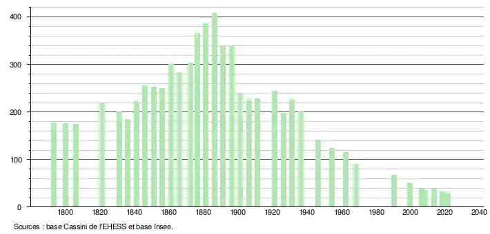 L'évolution du nombre d'habitants est connue à travers les recensements de la population effectués dans la commune depuis 1793. Pour les communes de moins de 10 000 habitants, une enquête de recensement portant sur toute la population est réalisée tous les cinq ans, les populations légales des années intermédiaires étant quant à elles estimées par interpolation ou extrapolation[15]. Pour la commune, le premier recensement exhaustif entrant dans le cadre du nouveau dispositif a été réalisé en 2008[16].