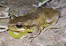 Le dos peut être foncé ou pâle, brun avec des bandes irrégulières, plus claires pour celles passant sur les côtés et partant derrière les yeux. Une bande foncée surmontant une bande blanche relie l'extrémité du museau aux tympans en passant par les yeux. Le ventre est crème devenant jaune chez le mâle pendant la période des amours. Les doigts sont palmés au tiers, les orteils aux deux tiers. Le tympan est bien apparent. L'iris est rouille. Pendant la saison des amours les mâles deviennent jaunes.