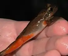 Son dos est de couleur brune ou gris-brun avec de nombreuses taches plus sombres et souvent une traînée noire. Le ventre est crème, l'iris est jaune, l'aisselle et la cuisse sont orange, ce qui permet de la distinguer de Litoria jervisiensis.