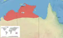 Cette espèce est endémique du Nord de l'Australie[1]. Elle se rencontre dans la région de Kimberley en Australie-Occidentale, dans la Terre d'Arnhem dans le Territoire du Nord et à la frontière au Queensland, jusqu'à 500 m d'altitude.