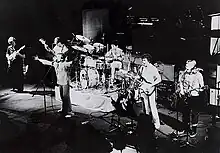 Little River Band sur scène en concert en 1977. De gauche à droite : Briggs, McArdle, Shorrock, Pellicci, Birtles and Goble.