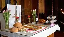 Les Saints Dons du sacrifice de la Divine Liturgie[Note 1] sont le pain et le vin.