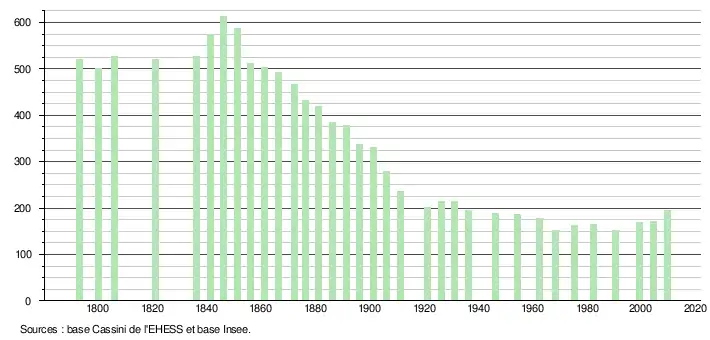 - Dans le tableau des recensements et le graphique, par convention dans Wikipédia, le principe a été retenu, pour les populations légales postérieures à 1999 de n’afficher dans le tableau des recensements et le graphique que les populations correspondant à l'année 2006, première population légale publiée calculée conformément aux concepts définis dans le décret no 2003-485 du 5 juin 2003, et les années correspondant à une enquête exhaustive de recensement pour les communes de moins de 10 000 habitants, ainsi que la dernière population légale publiée par l’Insee.