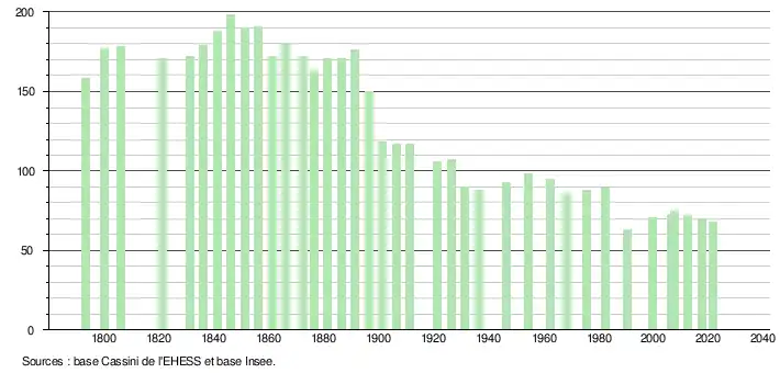 L'évolution du nombre d'habitants est connue à travers les recensements de la population effectués dans la commune depuis 1793. Pour les communes de moins de 10 000 habitants, une enquête de recensement portant sur toute la population est réalisée tous les cinq ans, les populations légales des années intermédiaires étant quant à elles estimées par interpolation ou extrapolation[22]. Pour la commune, le premier recensement exhaustif entrant dans le cadre du nouveau dispositif a été réalisé en 2007[23].