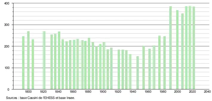L'évolution du nombre d'habitants est connue à travers les recensements de la population effectués dans la commune depuis 1793. Pour les communes de moins de 10 000 habitants, une enquête de recensement portant sur toute la population est réalisée tous les cinq ans, les populations légales des années intermédiaires étant quant à elles estimées par interpolation ou extrapolation[21]. Pour la commune, le premier recensement exhaustif entrant dans le cadre du nouveau dispositif a été réalisé en 2006[22].