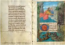 Au fº 122v, on peut lire une mention écrite en majuscules, dans un style très différent de celui du reste du manuscrit : « HIERONIMI BOSCII BELGAE PROPRIA MANVS » (« De la propre main de Jérôme Bosch de Belgique »), suivie d'un prix en minuscules : « 670 sols », soit plus de 30 livres. En face, l'enluminure du f° 123r, consacrée à saint Christophe, est encadrée par une scène de combat entre des hommes sauvages et un monstre aquatique ayant l'aspect d'un chevalier en armure doté d'une queue de poisson. Ce dernier n'est pas sans rappeler les tritons à tête de heaume visibles sur le panneau central du Jardin des délices. Si les drôleries des manuscrits médiévaux ont un lien évident avec les « diableries » de Bosch[8], la participation du maître de Bois-le-Duc à l'enluminure d'un ouvrage n'est cependant pas documentée. De plus, l'inscription date vraisemblablement de la seconde moitié du XVIe siècle[9], c'est-à-dire d'une époque où l'intérêt pour les œuvres de Bosch encourageait la réalisation de copies, de pastiches et de faux.