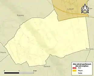Le retrait-gonflement des sols argileux est susceptible d'engendrer des dommages importants aux bâtiments en cas d’alternance de périodes de sécheresse et de pluie[32]. 0,5 % de la superficie communale est en aléa moyen ou fort (59 % au niveau départemental et 48,5 % au niveau national)[Carte 3]. Depuis le , en application de la loi ELAN, différentes contraintes s'imposent aux vendeurs, maîtres d'ouvrages ou constructeurs de biens situés dans une zone classée en aléa moyen ou fort[Note 5],[33].