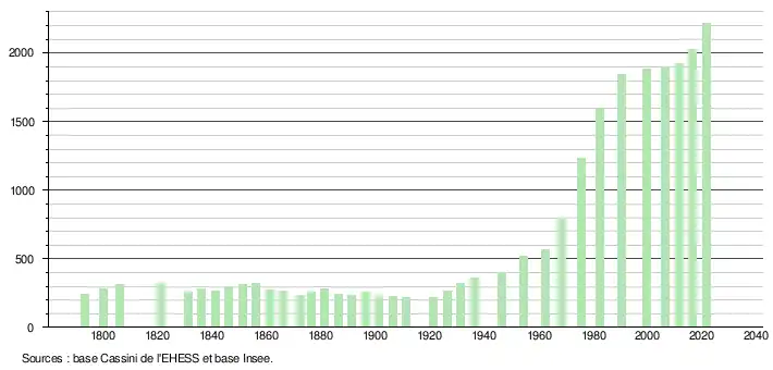 L'évolution du nombre d'habitants est connue à travers les recensements de la population effectués dans la commune depuis 1793. Pour les communes de moins de 10 000 habitants, une enquête de recensement portant sur toute la population est réalisée tous les cinq ans, les populations légales des années intermédiaires étant quant à elles estimées par interpolation ou extrapolation[44]. Pour la commune, le premier recensement exhaustif entrant dans le cadre du nouveau dispositif a été réalisé en 2006[45].