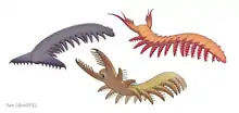 Les radiodontes (en) sont un groupe-racine des arthropodes possédant des palettes corporelles, des appendices frontaux arthropodisés et des yeux composés sur pédoncule.