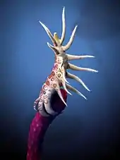 La tête est plus ou moins bulbeuse[3] et peut porter une paire d'appendices pré-oculaires protocérébraux[17] – par exemple des antennes primaires[27],[25],[17],[12] ou des appendices frontaux bien développés[3],[11],[30],[5] bien distincts des lobopodes du tronc[17],[31] (à l'exception d’Antennacanthopodia, qui a deux paires d'appendices sur la tête au lieu d'une[27]). La bouche peut comporter des rangées de dents[26],[15],[30],[5],[32] ou un proboscis conique[33],[3]. Les yeux peuvent être représentés par une ou plusieurs[34] paires d'ocelles simples[3], comme on le voit chez Paucipodia[26], Luolishania[25], Miraluolishania (en)[34], Ovatiovermis[35], Onychodictyon[33], Hallucigenia[15] et peut-être aussi Aysheaia[33]. Chez les lobopodiens à branchies comme Kerygmachela, les yeux sont cependant des taches réflectrices relativement complexes[36],[37].