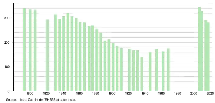 L'évolution du nombre d'habitants est connue à travers les recensements de la population effectués dans la commune depuis 1793. Pour les communes de moins de 10 000 habitants, une enquête de recensement portant sur toute la population est réalisée tous les cinq ans, les populations légales des années intermédiaires étant quant à elles estimées par interpolation ou extrapolation[5]. Pour la commune, le premier recensement exhaustif entrant dans le cadre du nouveau dispositif a été réalisé en 2004[6].