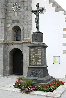 Pourtant, la croix actuelle ne porte ni écusson ni date. Elle est en granite de Trégana et a été érigée là en 1801 en remplacement d'une croix ancienne détruite pendant la Révolution[66]. Cette croix provenait de Pont-Rohel et était surnommée Croix de Anglais sans doute en souvenir de l'expédition anglaise de 1558 qui ravagea Le Conquet, l'abbaye de Saint-Mathieu et Plougonvelin[Note 4].