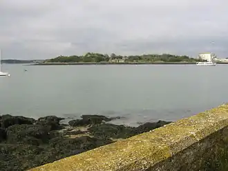 Le propriétaire de l'île, seigneur d'Hennebont, maitre du Kemenet-Héboé, disposait dès avant le XIe siècle du droit de prélever une taxe sur les marchandises circulant par bateau sur la rade, ainsi que sur le vin débarqué au port de Blavet. Cependant, Huelin d'Hennebont[Note 4] fit don en 1037 de cette île stratégique ainsi que des églises Saint-Gurthiern et Saint-Méloir de l'île de Groix à l'abbaye Sainte-Croix de Quimperlé, lui assurant de confortables revenus[28]. Les abbés y établirent le prieuré de Saint-Michel-des-Montagnes[29].