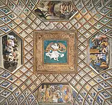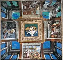 Sous chaque voûte, il y a quatre « histoires » à fresque entourées de cadres en stuc de formes variées (hexagonales, rectangulaires ou nervurées), tandis qu'aux angles se trouvent des grotesques ou des décorations architecturales ; des armoiries se trouvent au centre des voûtes : dans celle centrale, l'emblème du pape Léon X avec les clés de saint Pierre, et dans toutes les autres, des victoires ou des génies du jeu, l'insigne personnel de Giovanni de' Medici avant de devenir pape[1].