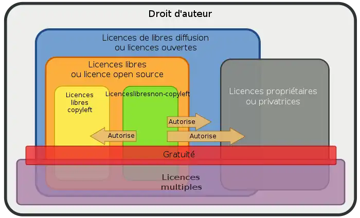 Ces droits peuvent être simplement disponibles — cas du domaine public — ou bien établis par une licence, dite « libre », basée sur le droit d'auteur. Les « licences copyleft » garantissent le maintien de ces droits aux utilisateurs même pour les travaux dérivés[réf. nécessaire].