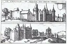 Les gravures concernant Moulidars sous l'Ancien Régime sont particulièrement rares et exceptionnelles pour que l'on puisse s'attarder sur celle-ci représentant « Le chasteau de Molida en deux sens ». Elle montre un corps de logis assez haut avec une toiture à pignon aigu entourée de trois tours d'angle et une tour d'escalier. Les bâtiments forment un U. C'est presque la même description que l'on pourrait faire de la Cour après sa reconstruction au XVe siècle. D'ailleurs l'abbé Tricoire dans son livre présentait la gravure de Chastillon comme celle du château de la Cour[9]. Cependant le château de la Cour ne comportait que deux tours d'angles dont une carrée : la tourasse.