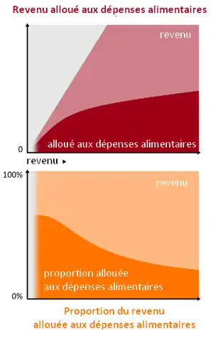 La loi d'Engel dispose que la part du revenu individuel alloué aux dépenses alimentaires diminue au fur et à mesure que le revenu augmente. Cela est vrai en valeur relative ; en valeur absolue, la part allouée aux dépenses alimentaires augmente avec le revenu jusqu'à se stabiliser[2].