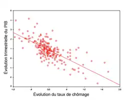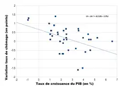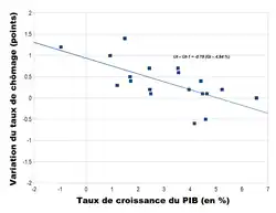 En outre, on peut constater que cette variation est fortement fonction des pays. En 1993, dans un article retentissant, cette relation a été mise en évidence par Martin Prachowny[11]. L'auteur, mettant en rapport la croissance du PIB sur les variations du taux de chômage, montre qu'une baisse de 3 % de la production augmente de 1 % le taux de chômage. L'ampleur de la baisse semble être en déclin au fil du temps aux États-Unis. Plus récemment, Andrew Abel et Ben Bernanke (2005), se fondant sur des estimations et des données récentes, montrent une baisse de 2 % de la production pour chaque point de pourcentage d'augmentation du taux de chômage[12].