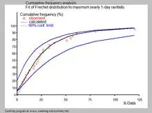 En hydrologie, la loi de Fréchet s'utilise pour des évènements extrêmes tels que le maximum annuel des précipitations journalières ou le débit des rivières[2]. La figure bleue illustre un exemple applicable de loi de Fréchet du maximum annuel des précipitations journalières en Oman, montrant également la bande de confiance de 90 % basée sur la loi binomiale.